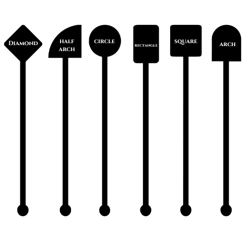 Available Design Shapes (see photos): Square, Circle, Half Arch, Arch, Rectangle, and Diamond